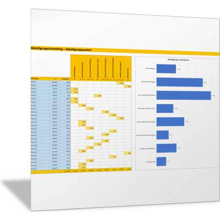 Mit dieser Excel-Vorlage erstellen Sie eine Liste aller Beteiligungen an Tochterunternehmen, geordnet nach der Höhe des Anteils am Eigenkapital des jeweiligen Tochterunternehmens. So erkennen Sie die Bedeutung der Beteiligung für Ihr Unternehmen. In einem Diagramm sind die Beteiligungen in Euro nach Quoten dargestellt.