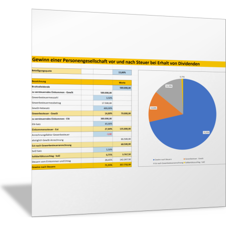 Mit der Excel-Vorlage ermitteln Sie aus der Beteiligungsquote und der Bruttodividende den Gewinn nach Steuern, sofern das Mutterunternehmen eine Personengesellschaft ist. In einem Diagramm wird der Anteil der einzelnen Steuerarten an der Gesamtsteuer sichtbar.