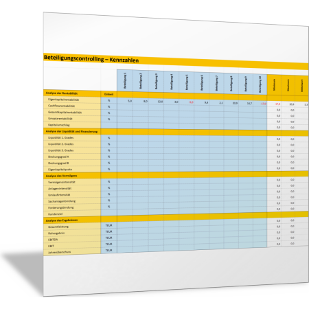 In dieser Excel-Tabelle stellen Sie wichtige Finanz- und Erfolgskennzahlen für bis zu zehn Beteiligungen an Tochterunternehmen zusammen. Kennzahlen können unter anderem sein: Eigenkapitalrentabilität, Kapitalumschlag, Liquidität, Forderungsbindung oder EBITDA. Es werden automatisch der höchste, der niedrigste und der Durchschnittswert aus dieser Liste der Beteiligungen ermittelt.