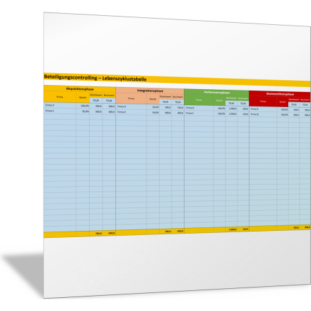 In dieser Excel-Tabelle stellen Sie zusammen, welche Beteiligungen an Tochterunternehmen sich in der Akquisitionsphase, Integrationsphase, Performancephase oder Desinvestitionsphase befinden. Es werden jeweils angegeben: Anteilsquote, Marktwert und Buchwert. So erkennen Sie, wie ausgewogen das Portfolio der Beteiligungen im Hinblick auf die Lebensphasen ist.