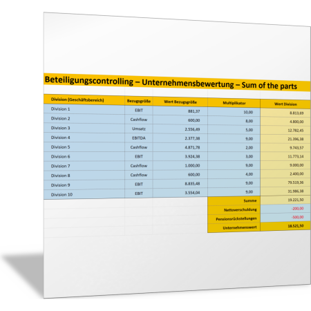 Mit dem Rechenschema dieser Excel-Vorlage können Sie den Wert der Beteiligung an einem Tochterunternehmen getrennt nach einzelnen Geschäftsbereichen des Unternehmens berechnen und aufzeigen; das sogenannte Sum-of-the-Parts-Verfahren. Sie können für bis zu zehn unterschiedliche Geschäftsbereiche einen Indikator (Bezugsgröße) wählen sowie einen Multiplikator festlegen. Aus der Summe der berechneten Werte ergibt sich der Gesamt-Unternehmenswert.