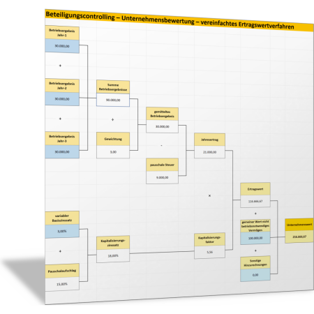 Mit dem Rechenschema dieser Excel-Vorlage können Sie den Wert der Beteiligung an einem Tochterunternehmen nach dem Ertragswertverfahren auf der Basis der Betriebsergebnisse der Vorjahre berechnen. Sie zeigen mit der Vorlage anschaulich, aus welchen Faktoren sich der Unternehmenswert berechnet und wie diese in die Rechnung eingehen. Das Ergebnis ist der Unternehmenswert nach dem sogenannten Ertragswertverfahren.