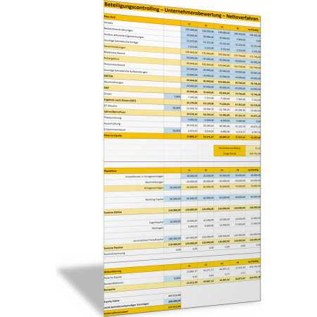 Mit dem Rechenschema dieser Excel-Vorlage können Sie den Wert der Beteiligung an einem Tochterunternehmen nach dem Cashflow-Verfahren oder Nettoverfahren berechnen und aufzeigen. Grundlage der Unternehmensbewertung ist der sogenannte Flow to Equity. Mit der Vorlage werden eine Plan-GuV und eine Plan-Bilanz der nächsten Jahre erstellt und daraus der jährliche Flow-to-Equity-Wert berechnet. Dieser wird abgezinst und dann zum Unternehmenswert summiert.