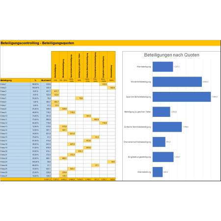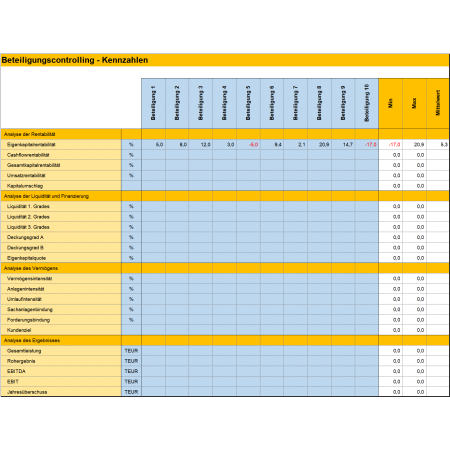 Die Planung, Steuerung und Kontrolle von Beteiligungen erfolgt auf der Basis von Kennzahlen. Dafür sind für Sie in diesem Handbuch-Kapitel mehrere Excel-Vorlagen vorbereitet, die Gewinne und Ertragspotenziale sichtbar machen. Beispiele: