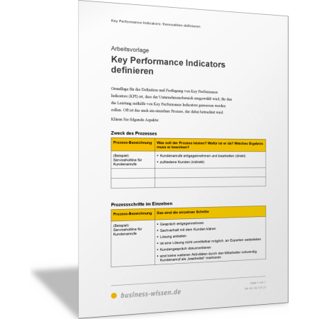 Ermitteln Sie mit dieser Vorlage, welche Kennzahlen als Key Performance Indicators (KPI) die Leistung eines Prozesses oder Ihres Verantwortungsbereichs am besten abbilden. Sie leiten die Kennzahlen aus dem Zweck des Prozesses, den Zielen und Ergebnissen und aus den Soll-Vorgaben ab, die Sie mit dem Prozess erreichen sollen. In der Vorlage definieren Sie dann die ein bis fünf KPIs, mit denen Sie in Ihrem Verantwortungsbereich und mit Ihrem Team arbeiten wollen. Nutzen Sie die Vorlage für die Information und die Abstimmung in Ihrem Team.