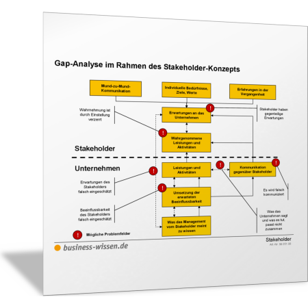 Das Modell der Gap-Analyse zeigt in der Übersicht, wie die Beziehung zwischen einem Stakeholder und Ihrem Unternehmen entsteht und wodurch sie geprägt wird. Insbesondere wird deutlich, wo Lücken (Gap) entstehen, die durch falsche Analysen, falsche Urteile oder mangelhafte Umsetzung des Stakeholder-Managements und der Stakeholder-Maßnahmen entstehen können.