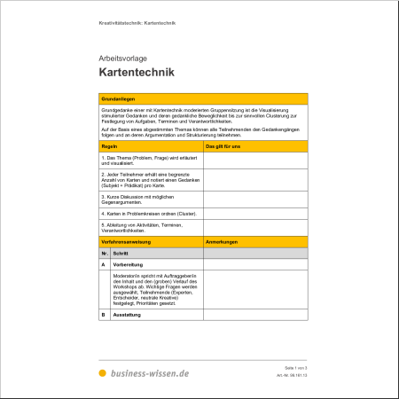Anschließend werden für jede Kreativitätstechnik die grundlegende Idee und ihre Besonderheiten erläutert. Zudem sind die Anwendungsbereiche sowie Aufwand und Nutzen beim Einsatz der Technik benannt. In der zugehörigen Vorlage ist die Kreativitätstechnik dann genauer beschrieben, mit der jeweiligen Vorgehensweise und mit Beispielen.