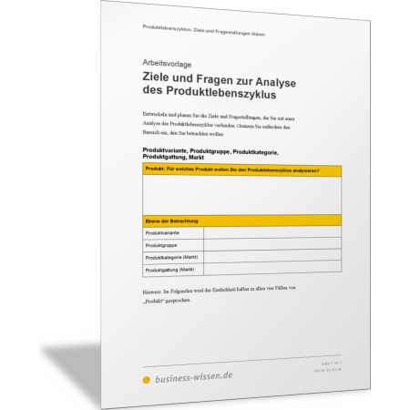 Mit dieser Vorlage erarbeiten und formulieren Sie die Ziele und Fragestellungen, die Sie erreichen und beantworten wollen, wenn Sie Absatz und Umsatz Ihrer Produkte nach dem Modell des Produktlebenszyklus analysieren. Erläutern Sie in dieser Vorlage alle Informationen, die für den Lebenszyklus und damit den Markterfolg Ihres Produkts wichtig sind.