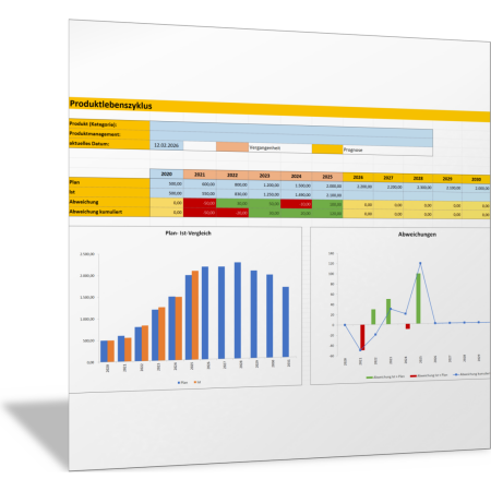 Mit dieser Excel-Vorlage erfassen Sie Absatz oder Umsatz für ein ausgewähltes Produkt über mehrere Jahre. In einem Diagramm wird dies als Produktlebenszyklus abgebildet. Gleichzeitig können Sie Plan- oder Soll-Werte mit den erreichten Ist-Werten vergleichen; die Abweichungen sind in einem zweiten Diagramm sichtbar. Die Tabelle erlaubt den Rückblick auf die Absatz- und Umsatzzahlen (Vergangenheit) sowie eine Prognose für die Zukunft.