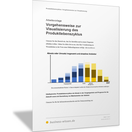 In dieser Vorlage ist erläutert, wie Sie den Bereich eingrenzen (Markt, Produkt und Zeit), für den Sie den Produktlebenszyklus visualisieren wollen. Um die entsprechenden Informationen darzustellen, müssen Sie diese zunächst ermitteln. In der Vorlage sind Quellen und Anlaufstellen für Marktstudien zur Marktentwicklung genannt. Halten Sie mit dieser Vorlage fest, welche Daten und Informationen Sie benötigen, um Ihren Produktlebenszyklus darzustellen, und woher Sie diese Informationen erhalten.