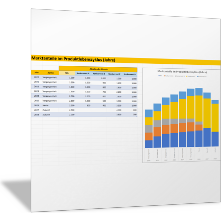 Mit dieser Excel-Vorlage können Sie den Absatz oder Umsatz eines Produkts im Zeitverlauf darstellen und so den Produktlebenszyklus visualisieren. Gleichzeitig zeigen Sie mit der Vorlage, wie viel Absatz und Umsatz die anderen Anbieter in Ihrem Markt (Ihre Wettbewerber) erzielen. Damit machen Sie die Marktanteile im Produktlebenszyklus und im Säulendiagramm sichtbar. Sie erkennen, wie sich Marktanteile im Laufe der Zeit und mit dem Produktlebenszyklus verändern.