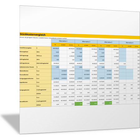 Mit dieser Excel-Vorlage stellen Sie für bis zu vier alternative Lösungen die Kosten zusammen und ermitteln dann jeweils die Gesamtkosten und die Stückkosten. So vergleichen und bewerten Sie beispielsweise unterschiedliche Herstellverfahren oder Arbeitssysteme miteinander; zum Beispiel die voll automatisierte, die halb automatisierte oder die manuelle Variante. Wirtschaftlich ist das Verfahren mit den geringsten Stückkosten.