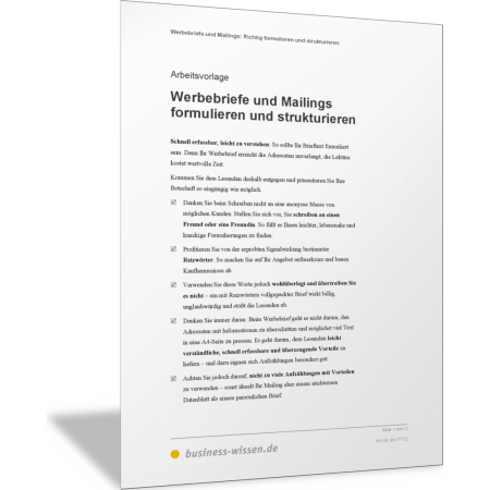 Schnell erfassbar, leicht zu verstehen: So sollte Ihr Brieftext formuliert sein. Denn Ihr Werbebrief erreicht die Adressaten unverlangt; die Lektüre kostet wertvolle Zeit. Kommen Sie den Leserinnen und Lesern deshalb entgegen und präsentieren Sie Ihre Botschaft so eingängig wie möglich. Dazu erhalten Sie in dieser Vorlage viele Tipps und Beispiel-Formulierungen.