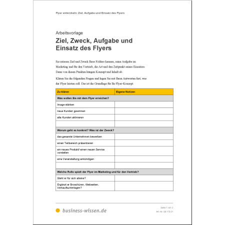 Für diesen ersten Schritt zu Ihrem Flyer-Konzept, können Sie für Vorlage Ziel, Aufgabe und Einsatz des Flyers klären nutzen.