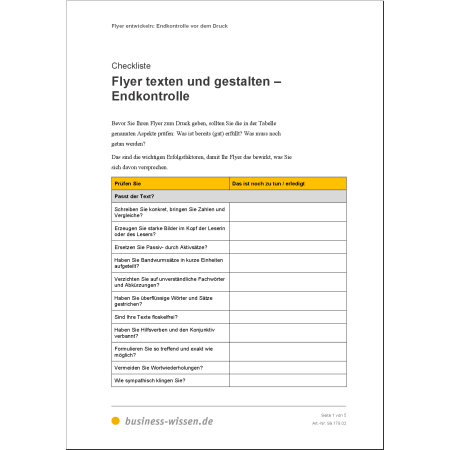 Wenn Sie mit den vielen Tipps und Beispielen zu Text und Gestaltung Ihren eigenen Flyer entwickelt haben, sollten Sie vor dem Druck die Endkontrolle durchführen. Hierfür hilft Ihnen die Checkliste Flyer texten und gestalten – Endkontrolle. Nun halten Sie bald Ihren gedruckten Flyer in Ihren Händen und können ihn verteilen.