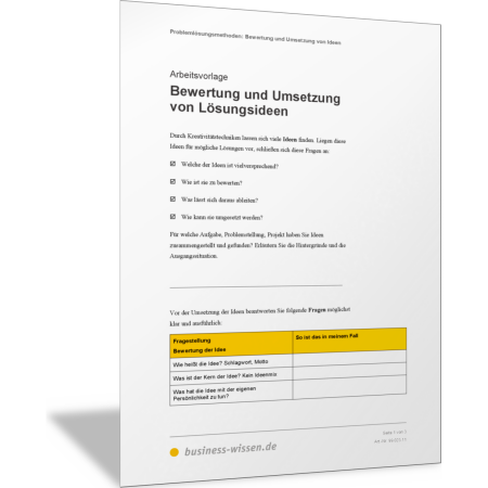 In dieser Vorlage sind zahlreiche Aspekte und Fragestellungen aufgeführt, die Ihnen helfen, Lösungsideen aus unterschiedlichen Perspektiven zu betrachten und zu bewerten. Sie helfen, Ihre Lösungen zu verbessern und auszuarbeiten.