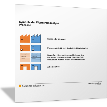 In der Vorlage finden Sie die typischen Symbole der Wertstromanalyse (Value Stream Mapping) für: