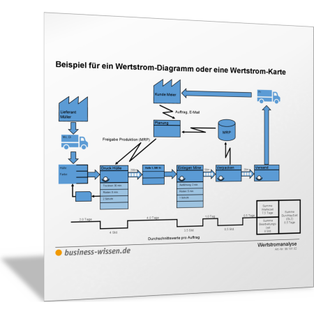 Die Abbildung zeigt ein Beispiel für die Visualisierung eines Prozesses nach der Methode der Wertstromanalyse: ein Wertstrom-Diagramm, auch Wertstrom-Karte genannt.