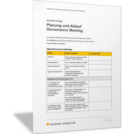 In dieser Vorlage sind die einzelnen Phasen (Schritte) und die Tagesordnungspunkte für ein Governance Meeting erläutert, wie es bei der Holakratie-Organisation regelmäßig durchgeführt wird. Damit können Sie Ihre Meetings planen und sich entsprechend vorbereiten. Das wesentliche Merkmal beim Ablauf eines Governance Meetings: Vorschläge und Anträge werden gemäß diesem Ablaufschema vorgestellt, diskutiert, bewertet und verbessert. Insbesondere werden Einwände zu den Vorschlägen systematisch abgearbeitet.