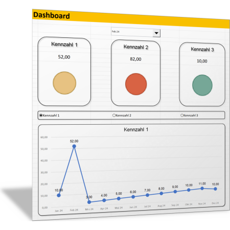 Mit dieser Excel-Vorlage können Sie drei Kennzahlen in einem Kennzahlen-Dashboard darstellen. Die Kennzahlenwerte werden grün, gelb oder rot, wie eine Ampel, markiert. Für eine ausgewählte Kennzahl werden die Werte im Zeitverlauf dargestellt.