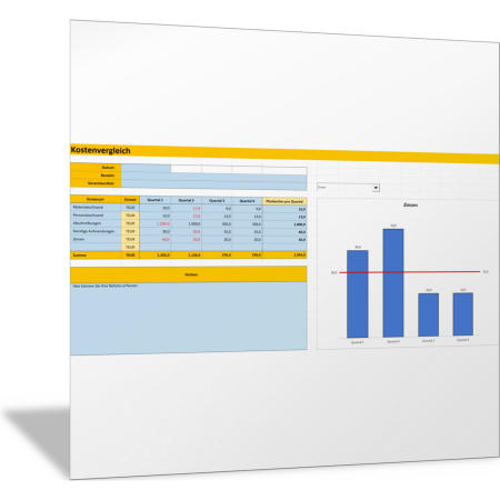 In der Vorlage vergleichen Sie den Kostenverlauf von Materialkosten, Personalkosten, Abschreibungen und anderen Kosten. Sie können selbst festlegen, welche Kostenarten Sie mit dieser Excel-Vorlage vergleichen wollen.