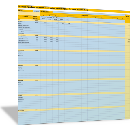 Mit dieser Excel-Vorlage erfassen Sie die Daten und Informationen für einen Prozessschritt als Grundlage für die Wertstromanalyse. In der Tabelle halten Sie für die wichtigsten Kennzahlen wie Bearbeitungszeiten, Lagerbestände und Qualitätskennzahlen mehrere Messwerte zu unterschiedlichen Zeitpunkten fest. Mit der Vorlage berechnen Sie dazu dann den Mittelwert (oder andere statistische Parameter).