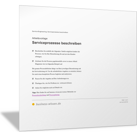 Beschreiben Sie mithilfe dieser Vorlage die Prozesse, wie Sie Ihre Dienstleistung für und mit dem Kunden erbringen. Zeichnen Sie die Prozesse in einem Ablauf-Diagramm wie im Beispiel in dieser Vorlage auf. Benennen und erläutern Sie einzelne Prozessschritte und Tätigkeiten. Stellen Sie heraus, was entscheidend ist für das Serviceerlebnis der Kunden. Planen Sie entsprechend alle Ihre Serviceleistungen und die damit verbundenen Serviceprozesse.