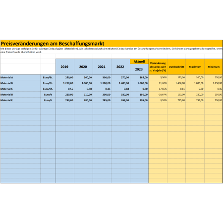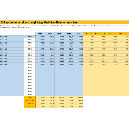 Für die Darstellung von Einkaufskennzahlen finden Sie in diesem Dokumentenpaket zahlreiche Excel-Vorlagen zu Kennzahlen, die im Einkauf relevant sein können. Zum Beispiel die Vorlagen Abrufquote aus Rahmenverträgen mit Lieferanten darstellen, Einsparungsquote im Einkauf darstellen, Anteil Maverick Buying im Einkauf erfassen oder eine Zusammenstellung in einem Kennzahlen-Dashboard für den Einkauf.