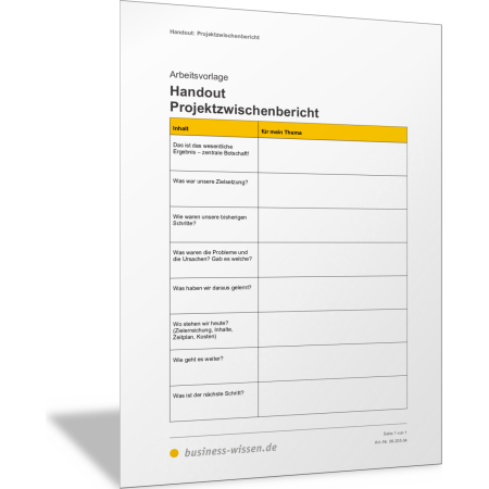 Diese Vorlage enthält die Gliederungspunkte eines Handouts, wenn dieses Informationen und Inhalte zu einem Projekt zusammenfassen soll. Es dient als Projektzwischenbericht oder Statusbericht. Befüllen Sie die genannten Punkte mit Ihren relevanten Informationen und erstellen Sie so im Handumdrehen eine Kurzfassung zum Stand Ihres Projekts.