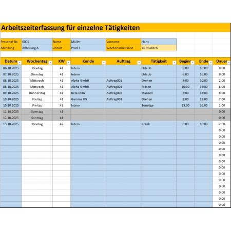 Wenn zusätzlich ausgewertet werden soll, wofür die Arbeitszeit eingesetzt wird (Kunden, Projekte etc.), dann sollten Sie die Vorlage Arbeitszeiterfassung Mitarbeiterin/ Mitarbeiter Projekte und Aufträge an alle verteilen und die Zeitaufschreibung, wie in diesem Dokumentenpaket beschrieben, organisieren.