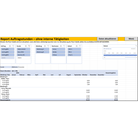 Dort können Sie mit der Excel Pivot-Funktion Berichte und Reports für die Auswertung erstellen. Einige Berichte sind in den Vorlagen bereits angelegt.