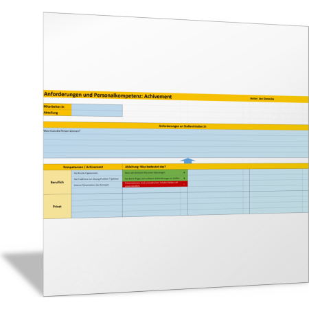 Mit dieser Vorlage halten Sie für eine Person aus Ihrem Team oder Ihrer Abteilung fest, welche besonderen Leistungen sie erbracht hat. Daraus leiten Sie die jeweiligen Kompetenzen und Potenziale ab. Diese vergleichen Sie mit den Anforderungen, die sich aus der jeweiligen Stelle oder aus zukünftigen Stellen ergeben. In der Excel-Vorlage können Sie farblich markieren, welche besonderen positiven Leistungen und Potenziale Sie erkennen (grün) und wo es Schwächen oder Defizite gibt (rot).