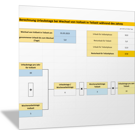 Mit dieser Excel-Vorlage berechnen Sie die Urlaubstage für Mitarbeitende, die von Vollzeit in Teilzeitarbeit wechseln oder umgekehrt. Sie können damit auch die jeweiligen Urlaubstage berechnen, wenn der Wechsel im Laufe des Jahres erfolgt.