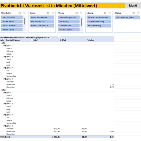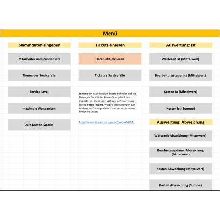 So können jeden Monat Hunderte oder Tausende Tickets entstehen, die mit dem Excel-Tool zur Analyse von Servicefällen und für das Service-Controlling ausgewertet werden. Für die Analyse werden Wartezeit für den Kunden, Bearbeitungsdauer und Kosten betrachtet und ein Plan-Ist-Vergleich durchgeführt.