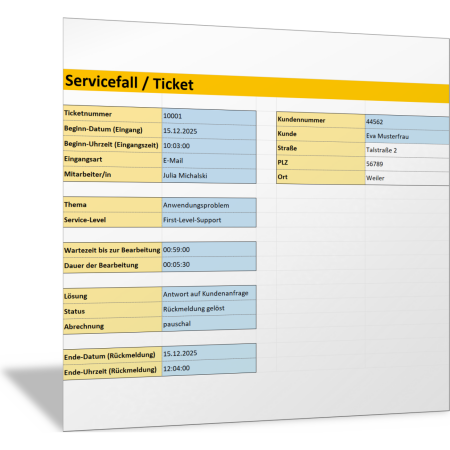 Mit dieser Excel-Vorlage lassen sich einzelne Fälle in Ihrem Kundenservice, der Kundenhotline oder im Callcenter, erfassen. Die Mitarbeitenden machen alle Angaben zum einzelnen Servicefall oder Ticket, Anruf, E-Mail oder Brief, die für eine spätere Analyse und für das Service-Controlling wichtig sind.
