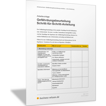 In dieser Vorlage sind die einzelnen Schritte für die Planung, Vorbereitung und Durchführung einer Gefährdungsbeurteilung im Unternehmen aufgeführt. Zu jedem Schritt finden Sie zudem die wichtigsten Aufgaben, die jeweils zu erledigen sind. Halten Sie in der Vorlage fest, was in Ihrem Fall im Einzelnen zu tun ist, wer dafür verantwortlich ist und bis wann die Aufgaben erledigt sein sollen. Damit haben Sie einen Überblick über Ihre Aktivitäten zum Arbeitsschutz und zur Gefährdungsbeurteilung.