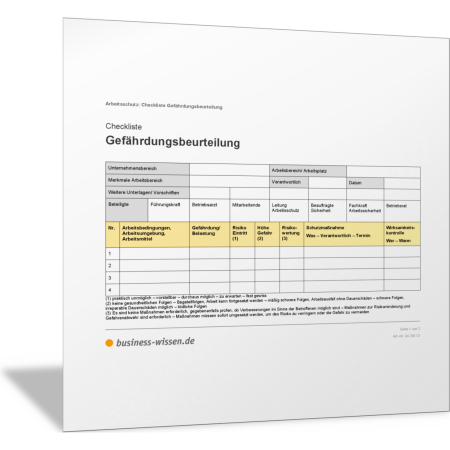 Diese Vorlage nutzen Sie als Formblatt oder Formular, um die Ergebnisse der Gefährdungsbeurteilung zu erfassen und zu dokumentieren. Füllen Sie dieses Formblatt aus, wenn Sie eine Vor-Ort-Begehung, Messungen oder Gespräche mit den Mitarbeitenden durchführen, um Gefahren zu erkennen und zu beurteilen. In dieser Vorlage können Sie zudem mögliche Maßnahmen festhalten, um die Gefahren zu vermeiden oder abzustellen. Ein Beispiel oder Muster zeigt, wie das Formblatt ausgefüllt sein kann.