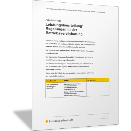 Mithilfe dieser Vorlage erstellt die Geschäftsleitung gemeinsam mit dem Betriebsrat oder Personalrat eine Betriebsvereinbarung zur Leistungsbeurteilung von Mitarbeitenden. In der Vorlage sind alle Aspekte benannt und erklärt, die eine Regelung und Betriebsvereinbarung enthalten sollte. Mit einer solchen Betriebsvereinbarung haben Sie eine Grundlage für die jährlichen Mitarbeitergespräche.