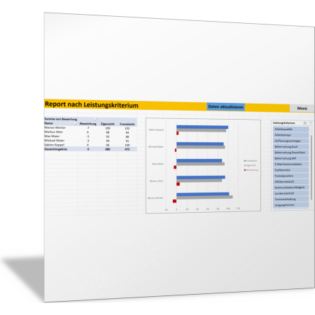 Mit diesem Excel-Tool erfassen Sie alle Leistungsbewertungen für die Mitarbeitenden in Ihrem Verantwortungsbereich und vergleichen und analysieren die jeweiligen Leistungen im Vergleich. Mit Power Query werden die einzelnen Leistungsbewertungen eingelesen und dann in Pivot-Berichten und Diagrammen aufbereitet. Sie erkennen, wer welche Leistungen erbringt, wo es Unterschiede zwischen den Mitarbeitenden gibt und wo Eigenbewertung und Fremdbewertung voneinander abweichen.