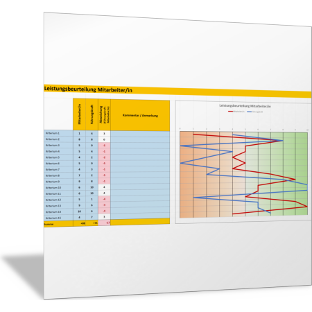 Wenn die Leistung der Mitarbeitenden von der Führungskraft und dem Betroffenen selbst bewertet wird, können Sie mit dieser Vorlage die einzelnen Bewertungen nebeneinanderstellen und vergleichen. Das Ergebnis wird in einem Diagramm aufbereitet. Sie erkennen, wo Mitarbeitende ihre Leistung anders bewerten als ihre Führungskraft. Sie können diese Abweichungen dann mit dem Mitarbeiter besprechen und nach den Gründen suchen.