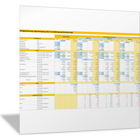 Mit dieser Excel-Vorlage vergleichen Sie Kosten, Umsatz und Gewinn bei der Eigenfertigung eines Produkts und bei der Fremdvergabe an Lieferanten (Outsourcing). Dabei können Sie bis zu drei Lieferanten in den Vergleich einbeziehen. Sie erkennen mit dieser Vorlage, ob Eigenfertigung oder Outsourcing rentabler ist.