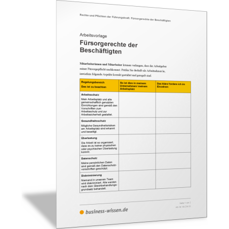 Mit dieser Vorlage erkennen Sie als Mitarbeiterin oder Mitarbeiter, welche Pflichten Ihre Vorgesetzte im Rahmen der Fürsorge haben. Prüfen Sie anhand der genannten Aspekte, ob und wie Ihre Vorgesetzten der Fürsorgepflicht nachkommen und wo gegebenenfalls (noch) Defizite sind. Dokumentieren Sie die Schwachstellen und mögliche Gefahren oder Risiken mithilfe dieser Vorlage. Sprechen Sie diese Aspekte gegenüber Ihrer Führungskraft an und bitten Sie um eine Lösung.