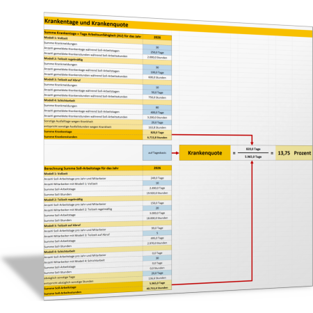 Mit dieser Excel-Vorlage berechnen Sie die Krankenquote für Ihr Unternehmen oder einen ausgewählten Bereich. Die Krankenquote ergibt sich aus der Zahl der Soll-Arbeitstage und der gemeldeten Krankentage. Mit dieser Vorlage berechnen Sie zunächst die Soll-Arbeitstage für Vollzeit-Mitarbeiter, für Teilzeit und Schichtarbeit. Dann halten Sie die Zahl der Krankmeldungen und der anrechenbaren Krankentage fest. Die Krankenquote kann damit auf Tagesbasis oder auf Stundenbasis berechnet werden.