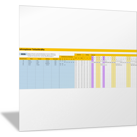 Mit diesem Jahresplaner planen Sie die Arbeitszeiten für Teilzeitkräfte in Ihrem Unternehmen. In einer Übersicht erkennen Sie, an welchen Tagen die Teilzeitkräfte arbeiten, wann sie Urlaub planen und wann sie Fehltage haben; zum Beispiel aufgrund von Krankheit oder Zeitausgleich. So hat Ihr gesamtes Team immer einen Überblick, wer wann da ist und wann nicht.