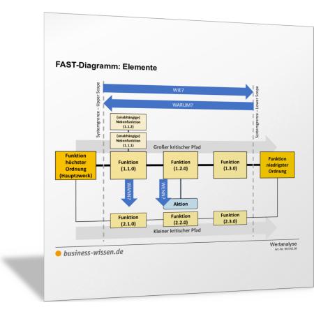 Die Darstellung zeigt den Aufbau und die Elemente eines FAST-Diagramms, wie es mit der Funktions-Analyse-System-Technik (FAST) erstellt wird. Die einzelnen Elemente werden so kombiniert und visualisiert, dass deutlich wird, welche Funktionen ein Produkt ausführt oder aus welchen Aktivitäten ein Prozess besteht. Das FAST-Diagramm ist so gegliedert, dass es Schritt für Schritt zeigt, WIE etwas funktioniert und WARUM es notwendig ist.