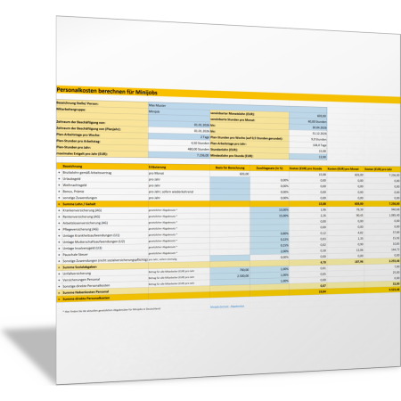 Mit dieser Excel-Vorlage berechnen Sie die Personalkosten für einen Minijob-Beschäftigten. Maßgeblich sind das vereinbarte Entgelt pro Monat und die pro Monat zu leistenden Arbeitsstunden. In der folgenden Vorlage sind die Abgabesätze für Minijobs hinterlegt, um die Lohnnebenkosten zu berechnen. Prüfen Sie mit dieser Vorlage, ob die Jahresverdienstgrenze und der Mindestlohn für Ihre Minijobber eingehalten sind. Außerdem berechnen Sie den Personalstundensatz für die entsprechende Arbeitskraft.