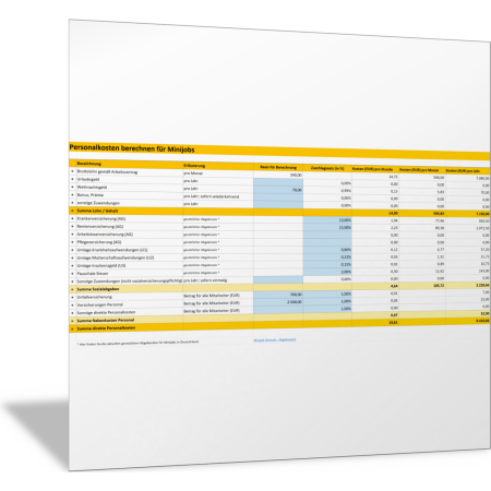 Mit dieser Excel-Vorlage legen Sie für Ihren Minijobber fest, welches Arbeitszeitmodell für ihn gilt und welches Entgelt vereinbart ist. Daraus ermitteln Sie: Personalkosten, Urlaubstage, Arbeitsstunden (pro Tag, pro Woche, pro Monat, pro Jahr, mit Berücksichtigung der Feiertage) und Personalstundensatz. Außerdem zeigt die Berechnung, ob Sie die Grenzen für geringfügig Beschäftigte einhalten.