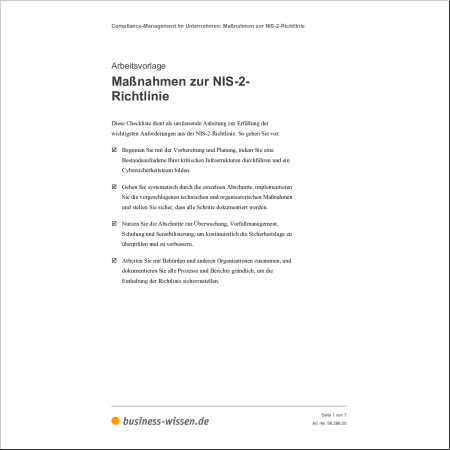 Deshalb sollten Sie einen Compliance-Beauftragten bestellen und ihm oder ihr die relevanten Aufgaben zuweisen. Was dazu gehört, wird in diesem Dokumentenpaket erklärt. Eine wichtige Aufgabe ist es, eine Compliance-Vereinbarung zu erstellen und im Unternehmen bekannt zu machen.