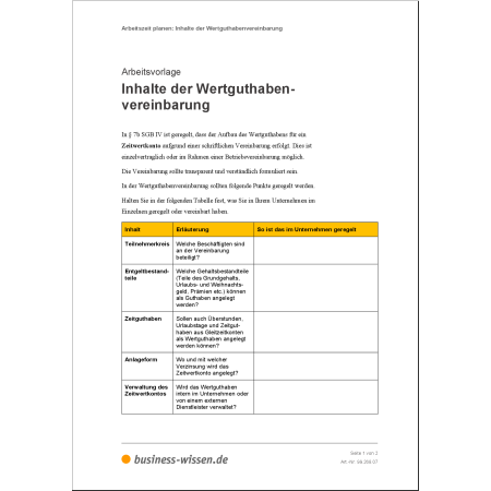Zudem sind in der Vorlage Inhalte der Wertguthabenvereinbarung die Aspekte genannt, die Sie in der Vereinbarung regeln sollten.