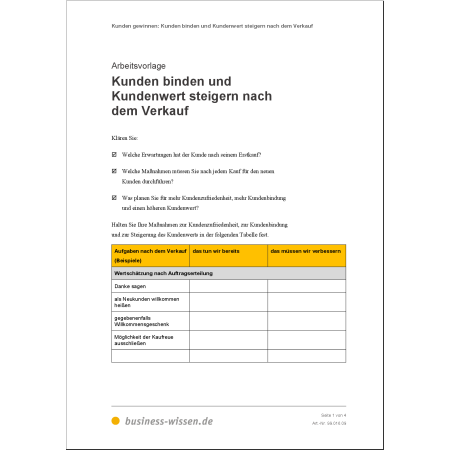 Mit diesem Dokumentenpaket legen Sie den Grundstein für eine erfolgreiche After-Sales-Strategie, die Ihre Kundinnen und Kunden begeistert und langfristig an Ihr Unternehmen bindet. Nutzen Sie die Chance, die Bearbeitungszeiten zu optimieren, die Kundenzufriedenheit zu steigern und den Kundenwert systematisch zu erhöhen.